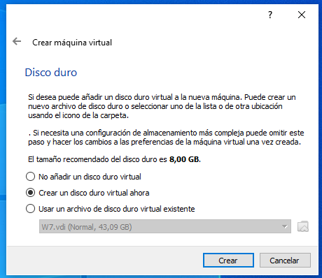 7.-Marcamos 8GB de tamaño para nuestro disco duro virtual y le damos a crear.